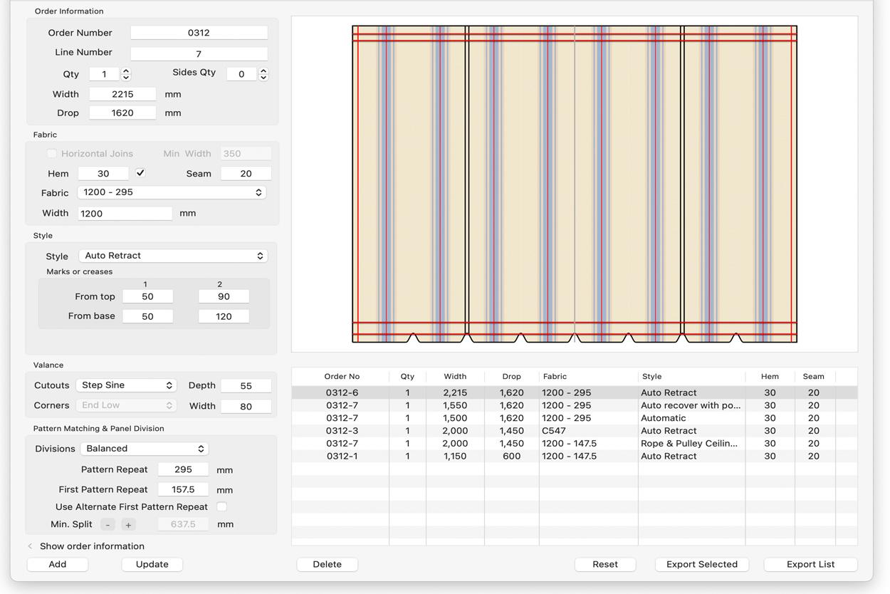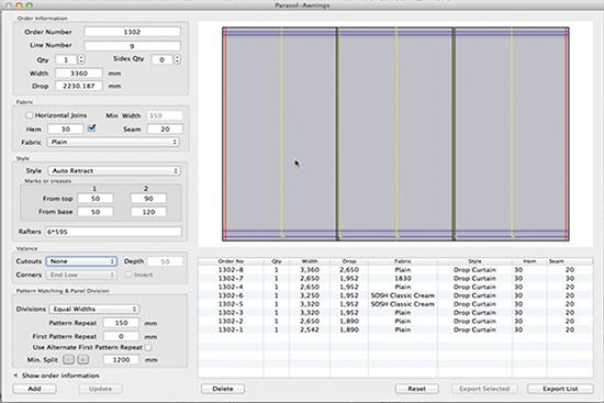 ParaSol has a fabric database which can be edited directly in ParaSol or imported as a CSV file from your order management system. Fabric widths, fabric orientation rules, stripe widths and positions, creasing or marking, cut speed and pressure… all these details are saved in with the fabric so selecting one, sets everything right down to when it's cut.