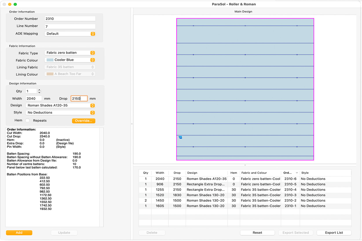 If someone has already entered the essential data - width, drop, design, fabric etc. you don't want to enter it again manually. With Automatic Data Entry (ADE) the process of developing a pattern is fully automatic. An order list sent from your factory management software will be opened by ParaSol to generate an entire list of designs ready to export to Tangent and cut.