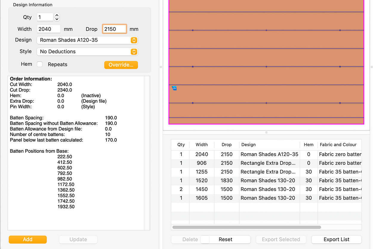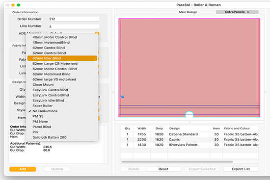 The roller, motor, fixing methods, pin width deductions etc. are all saved in ParaSol's style database. Selecting a style will automatically make all the necessary changes to the measured size to produce reliably consistent patterns across your whole product range.