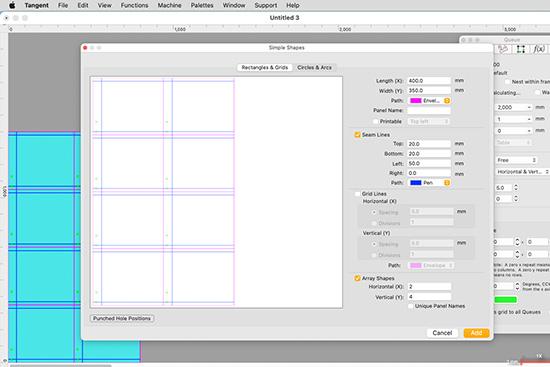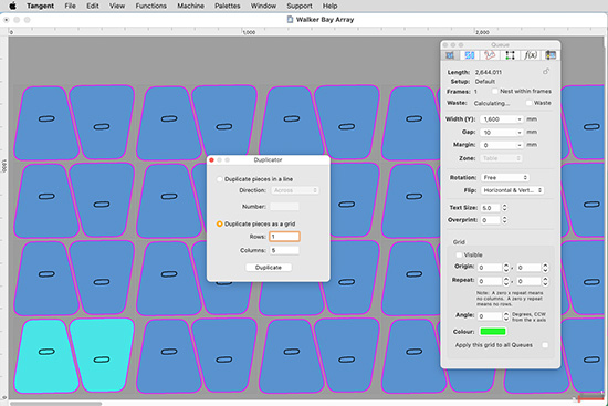 Patterns can be quickly and simply duplicated or arrayed in a queue. Here, a grouped pair of patterns has been arrayed vertically and horizontally in a queue.