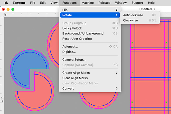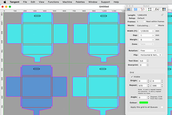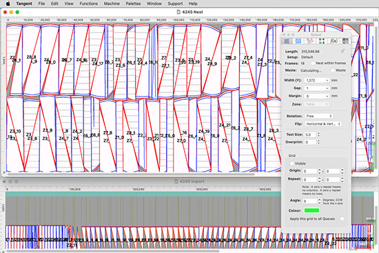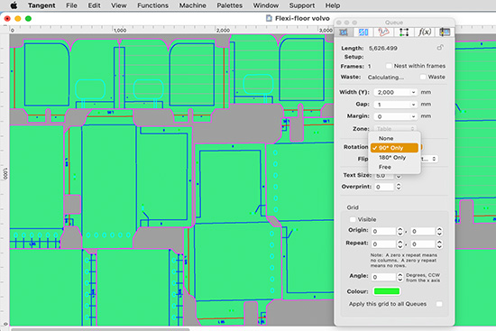 Queues and templates can have rotation rules set to control whether patterns can be rotated or not and by what degree. This is essential for many jobs from composites to cardboard where the grain of the material affects the product.