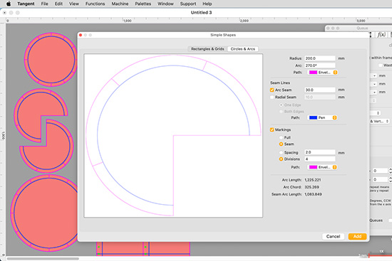 Circles and Arcs is an excellent tool for creating circular and wedge shaped reinforcements and patterns. Cones too. Strike marks and seams can be added to the pattern.