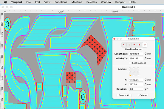 Tangent's Fault Line feature lets you identify faults with fabric such as marks, pulled threads and holes and interactively reposition patterns or auto nest around them.