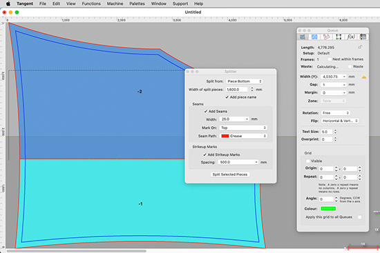 Patterns can be easily divided into panels suitable for nesting onto fabric using Tangent's Splitter function. Splitter will renumber panels, add seam lines and strike marks.