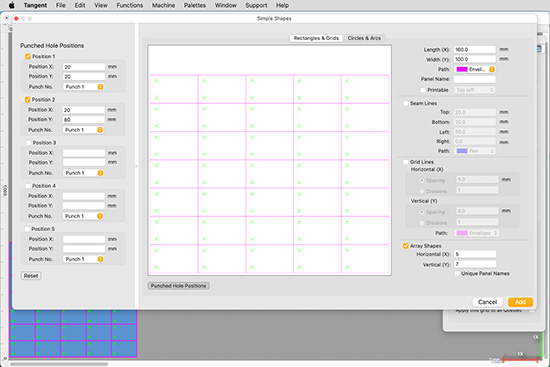 Alignment grids can be created in the queue to allow patterns to be aligned with features on fabric or tiled material on the cutting table. Grids can be angled to align with fabric which isn't straight.