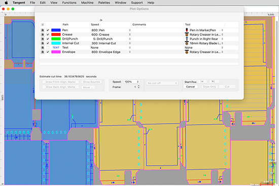 The order that tool paths are run, their visibility, whether they're active or not, the overcut and undercut settings for each tool can be easily understood and controlled in Tangent's plot window.