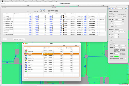 Tangent uses templates to help you speed up working with different materials. Cut speeds, fabric width, tool pressures, overcut and undercut values can be saved to a template so new patterns can be imported with the correct cut settings.
