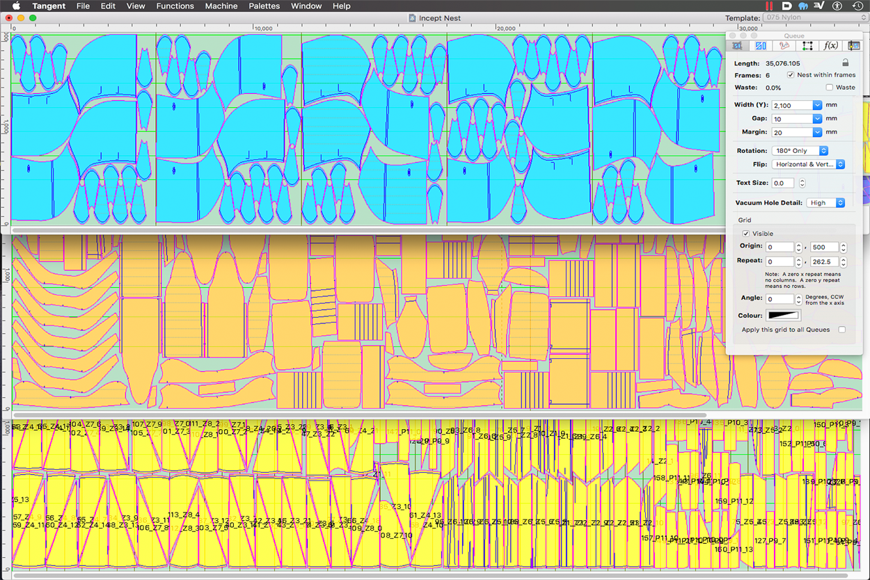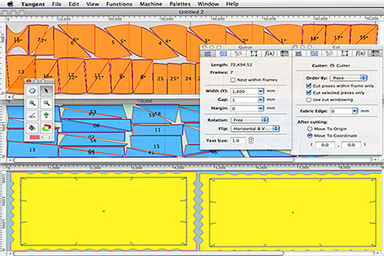 Developed expressly for working for the special requirements of technical textiles, Tangent is simple enough for anyone to use but has features enough for the expert user on critical work. Unlike most garment work, technical textile cutting can require multiple tools, individual speeds and paths for internal and external cuts, creases, punch marks and annotation. Tangent has all this and a lot more.